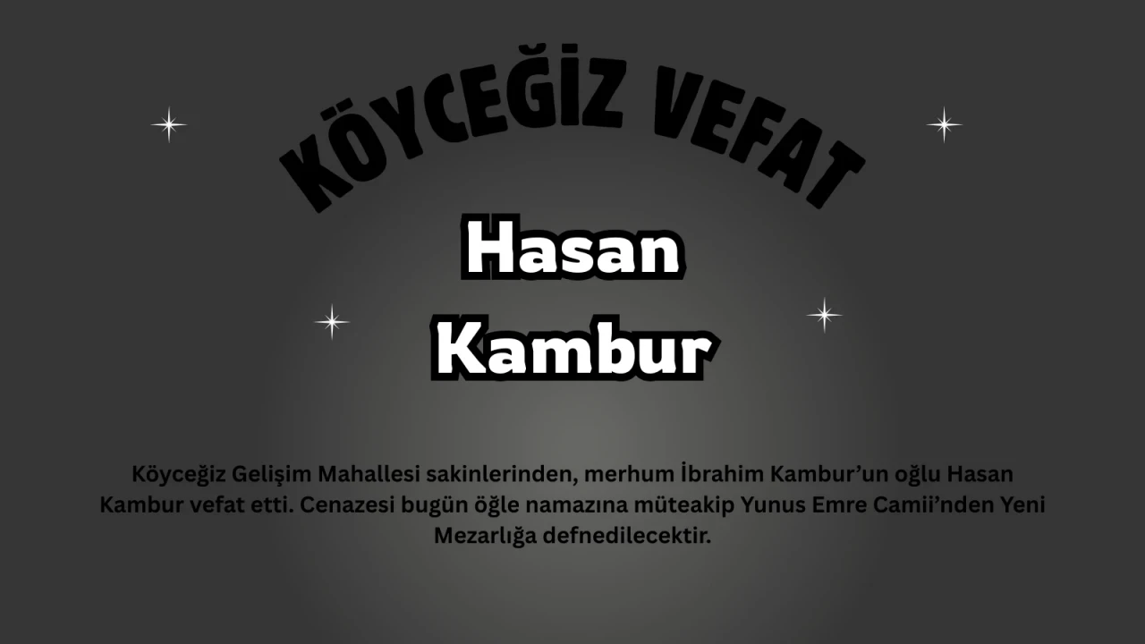 Gelişim Mahallesi’nin değerli isimlerinden, Örenlilerden merhum İbrahim Kambur'un oğlu Hasan Kambur, bugün öğle namazını takiben Yunus Emre Camii’nde kılınacak cenaze namazının ardından Yeni Mezarlığa defnedilecektir. Merhuma Allah’tan rahmet, kederli ailesine ve tüm sevenlerine başsağlığı ve sabırlar diliyoruz. Köyceğiz’in başı sağ olsun.